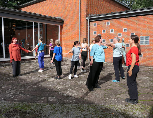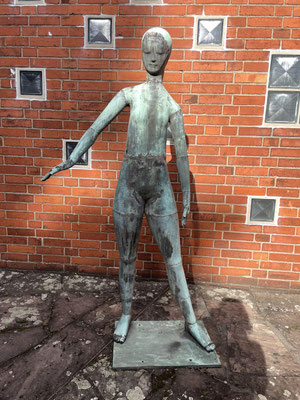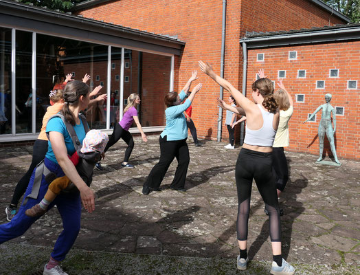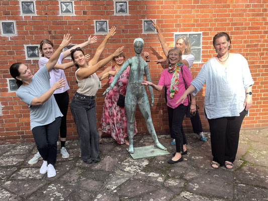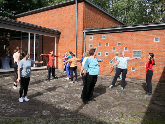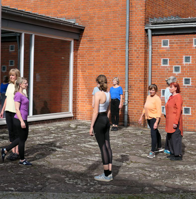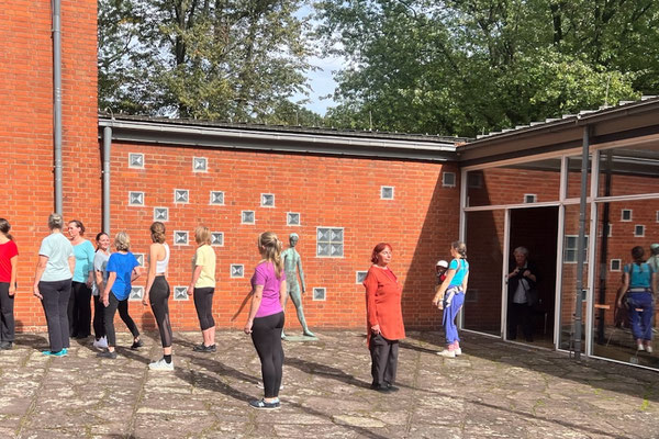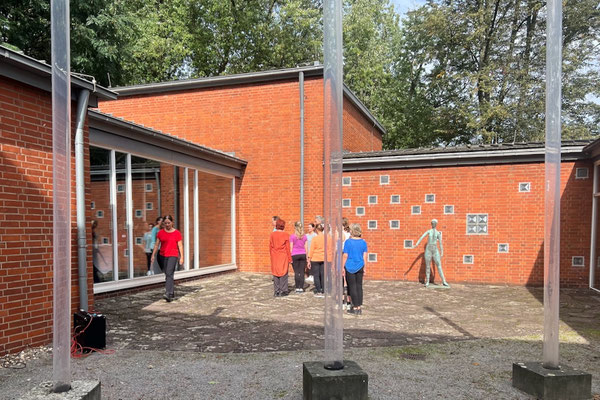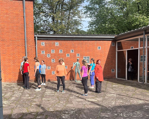 Recht ungewöhnlich war der Einblick in das Projekt In C, den die ZuschauerInnen erhielten, denn getanzt wurde im Innenhof des Grimme-Instituts! Umrahmt von Skulpturen und den Mauern des denkmalgeschützten Gebäudes präsentierten die Tänzerinnen das Intro sowie vier der 52 Tanzfiguren des Stückes. Dabei verharrte ein „Junges Mädchen“ am Rande des Geschehens durchgehend in seiner Position, quasi einer Ruhe-Geste aus der Tanzfigur Hug. Schon 1955 war sie aus Kupfer gegossen worden, vom KünstlerJoseph Jaekel.