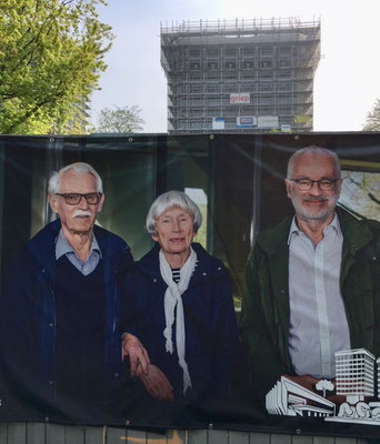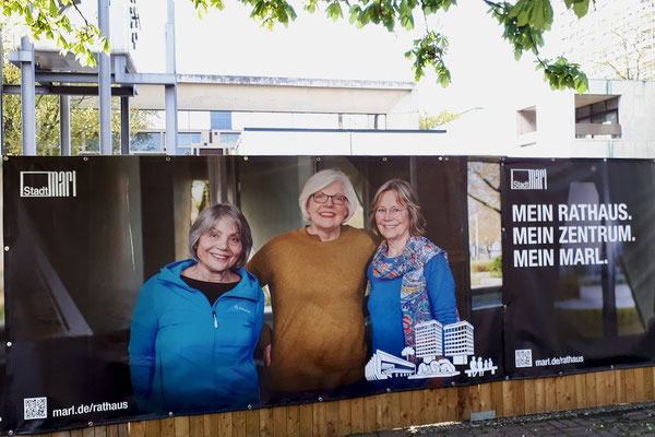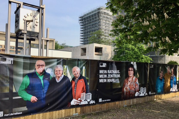 Die Arbeiten am Marler Rathaus schreiten voran, auch der Sitzungstrakt ist mit einem großen Teil des Creiler Platzes inzwischen von einem Bauzaun umschlossen. Darauf werden seit Ende April 2022 Fotos von über vierzig Marler BürgerInnen präsentiert, die der Rathaussanierung ein Gesicht geben. Mitglieder von Zukunft findet Stadt sind dabei.